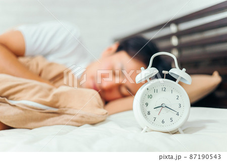 ベッドで寝る女性 アラーム 寝坊