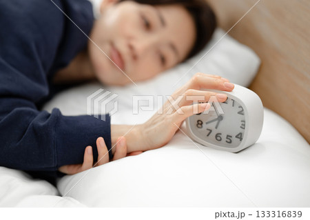 めざまし時計を止める30代女性