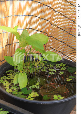 睡蓮鉢で泳ぐたくさんの可愛いメダカ
