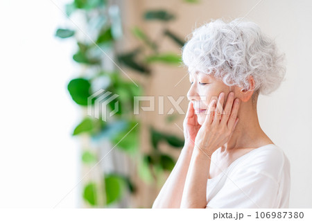 お肌の保湿を実感するシニア女性。