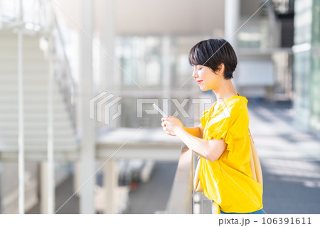 スマートフォンを操作する若い女性。