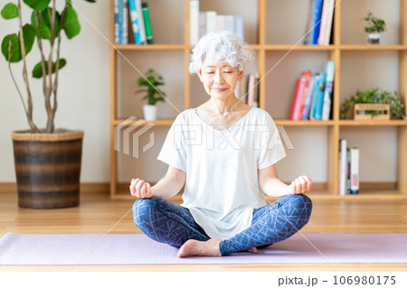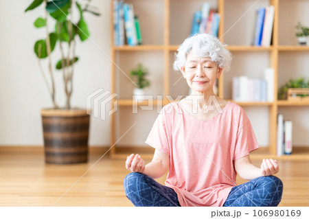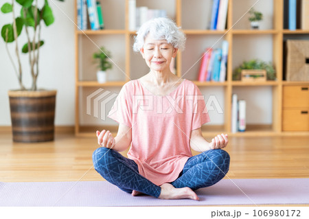 リビングでヨガをするシニア女性。