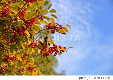 真っ赤なモチノキの実と青空