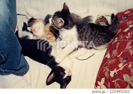 切り株の上で遊ぶ四匹の兄弟仔猫
