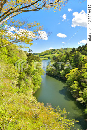 栃木県那須塩原市 新緑の木々に包まれる塩原ダムの風景
