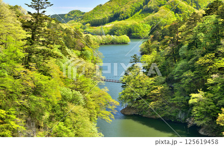 もみじ谷大吊橋付近 塩原ダム湖 春の景色