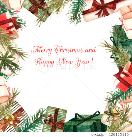 watercolor Christmas tree in the snow, red berries, two bullfinches birds, frame, template with event symbol, hand drawn sketch of green fir branches, composition, winter illustration for Christmas