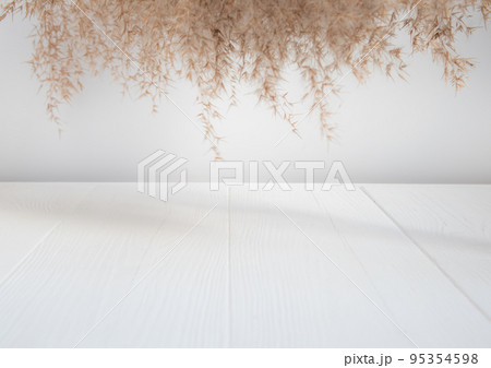 Advertising space with geometric shapes. Cylindrical wooden podium on a white background with pampas grass. A stage for a product demonstration, a showcase.