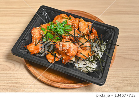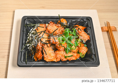 お持ち帰りの弁当、焼き鳥親子丼【白背景・切り抜き】