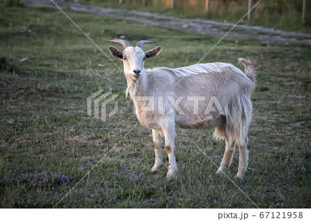 Goat eating withered grass, Livestock on a pasture. White goat. Cattle on a village farm. Cattle on a village farm.