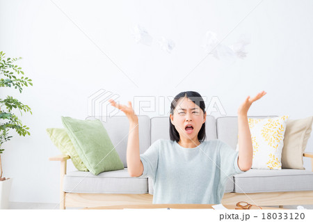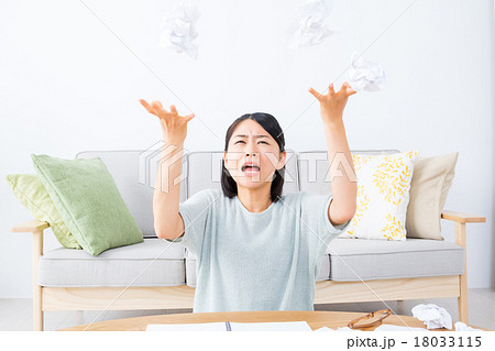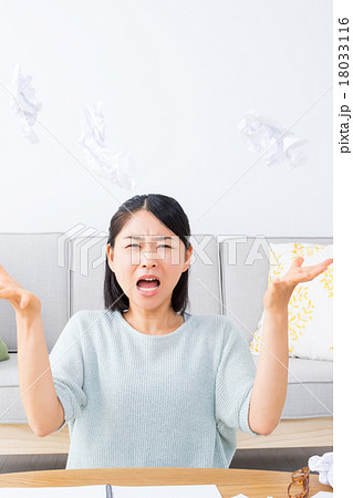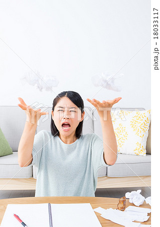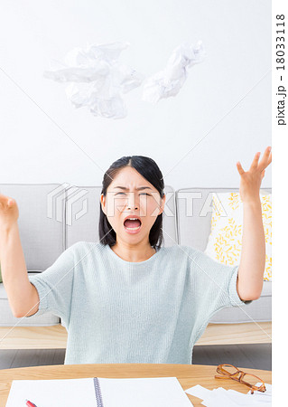 やけくその女性 執筆活動につかれた女性 紙を投げる ぐちゃぐちゃにした紙 うんざりした顔 女の人
