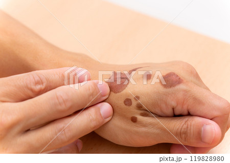 Measles, Women scratch the upper arm with one hand due to the numerous red pruritus., Measles is a disease that can spread easily.