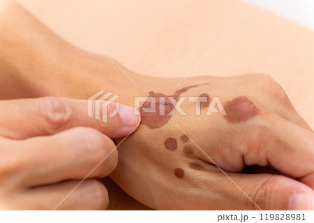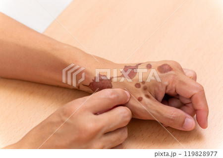 Close up of burn scar on a woman's hand. The skin damage in first-degree on outer layer skin.