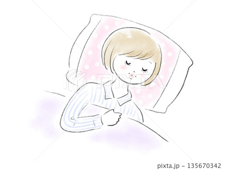 布団(もしくはベッド)で眠っている若い女性の上半身イラスト