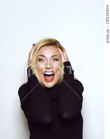 Beautiful blonde girl in a black dress.