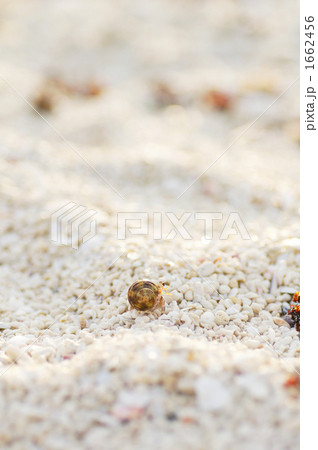 白砂ビーチを歩く白い貝殻のヤドカリ