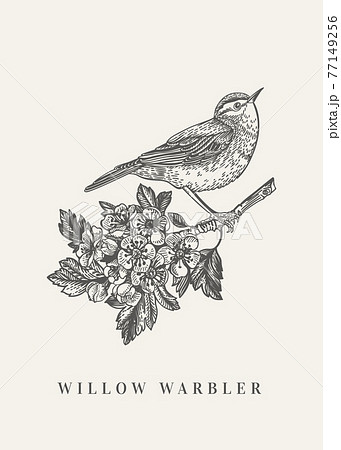 Eurasian blackcap male singing on willow tree branch in spring