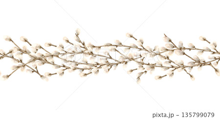 Spring seamless pattern with sprigs of willow. Easter hand drawn vector illustration, holiday background. Branch with pussy willow buds. Design for banner, poster, card, paper