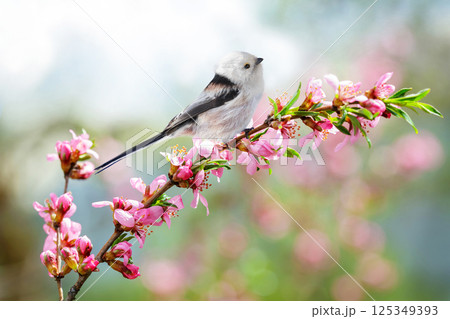Bird perching on branch of blooming almond tree with pink flowers. Long tailed tit. Aegithalos caudatus
