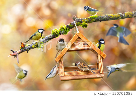 Group of little birds feeding on bird feeder with sunflower seeds on autumn background. Great tit, blue tit, sparrow, nuthatch