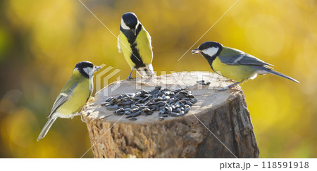 Birds feeding on bird feeder with sunflower seeds on autumn background. Great tit