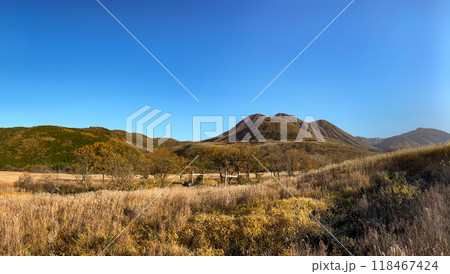 早朝のくじゅう長者原 タデ原湿原 三俣山 やまなみハイウェイ