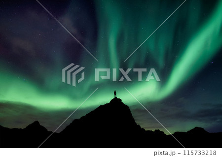 Aurora borealis with starry glowing over hiker standing on summit mountain in the night