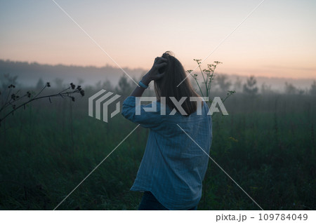 Outdoor shot of girl standing on top of hill, holding her hand near head, enjoing beautiful nature, having active rest in mountains, femalr wearing casual clothes, looks dreamy. Traveling concept.