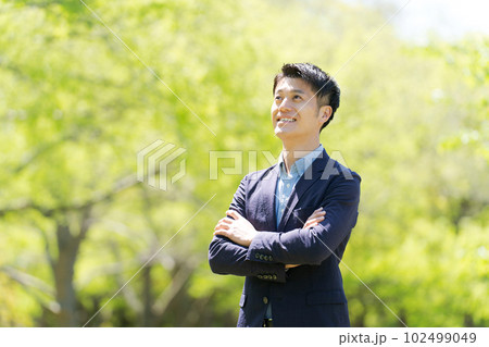 鮮やかな芝生を背景に真剣にスマホで商談するビジネスマン カメラ目線