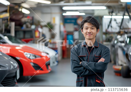 車の前で腕組みする作業着を着たミドルの自動車整備士の男性