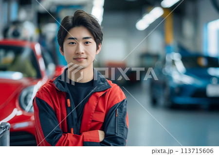 車の前で腕組みする作業着を着たミドルの自動車整備士の男性