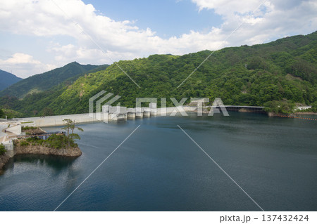 新緑の山々に囲まれた巨大な八ッ場ダムの堤体と広大なダム湖