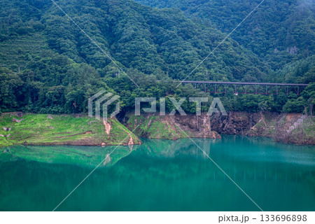 八ッ場ダムと新緑の湖面を望む夏の長野原町の風景