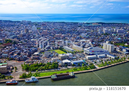 朱鷺メッセ Befcoばかうけ展望室より二葉マリナー方面の街並みと日本海を望む