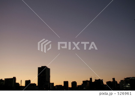 夕暮れのグラデーションの空とシルエットの高層ビル
