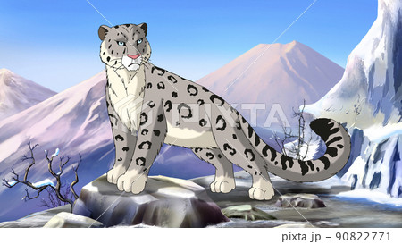 Majestic Snow Leopard in a Vibrant Mountain Landscape Artwork Illustration