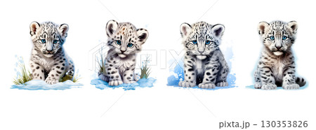 Four adorable, stylized watercolor illustrations of fluffy leopard cubs with bright blue eyes. Animals.