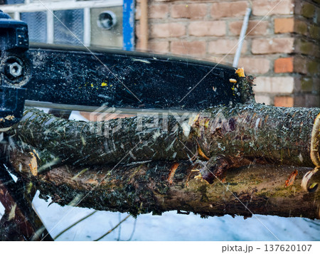 Chainsaw blade cutting through a tree log during a cold winter day, creating wood chips and sawdust flying around the work area, symbolizing hard work and forestry.