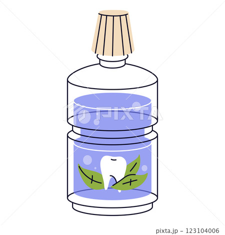 Mouth rinse or mouthwash liquid. Vector icon of oral care product for fresh breath and dental hygiene. Bottle for bathroom teeth cleaning routine, cavity protection, plaque prevention. Tooth health.