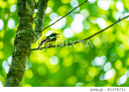 樹木の枝にとまり斜め上を向く夏鳥のキビタキ