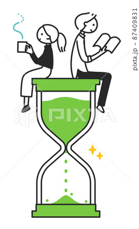 砂時計を見て悩む男性と喜ぶ女性 ちまっとした人物