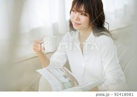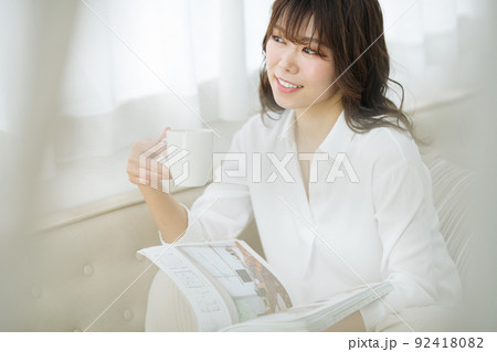 自宅でコーヒーを飲みながら雑誌を読む女性