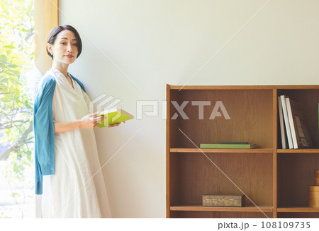 窓辺にもたれて本を読むミドル女性