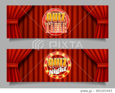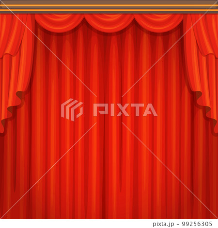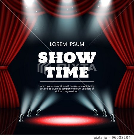 Broadway theater curtains. Award show. Stage red drapery and spotlights. Movie night or showtime. Casino lights. Cinema event. Illuminated circle. Presentation banner. Vector background