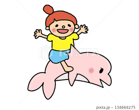 イルカに乗って夏のレジャーを楽しむおかっぱ頭のかわいい女の子