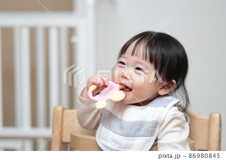 歯固めのオモチャで遊ぶ生後10ヶ月の赤ちゃん