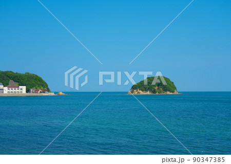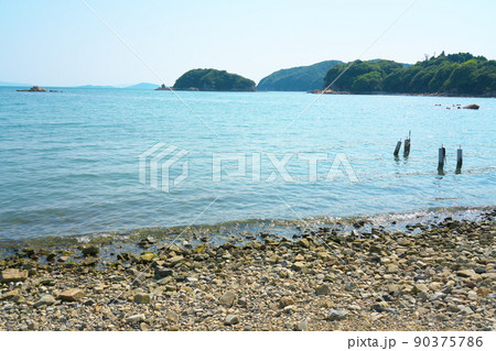 晴れた初夏の長島からみた岩礁と小豆島と鳥 岡山県瀬戸内市邑久町