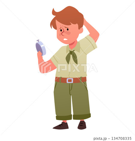 Scout boys exploring compass in the forest, vector tourism hiking orientation, camping and travel equipment camping gear