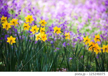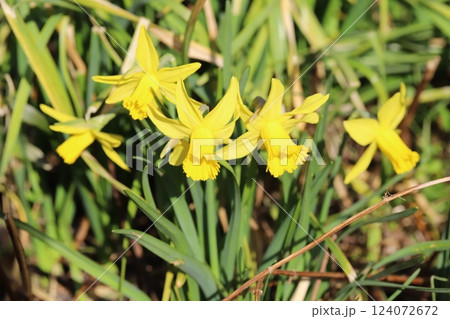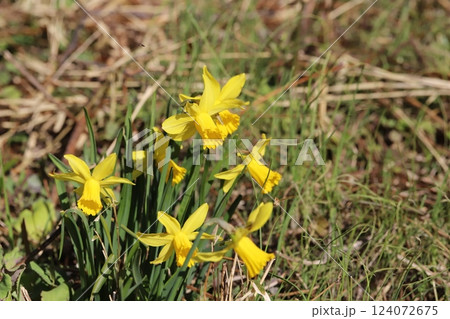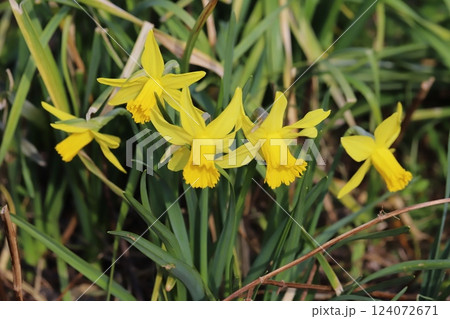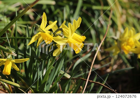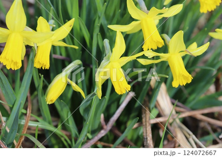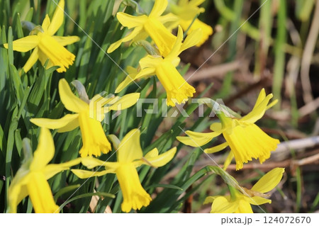 春の公園に咲くラッパズイセンの黄色い花