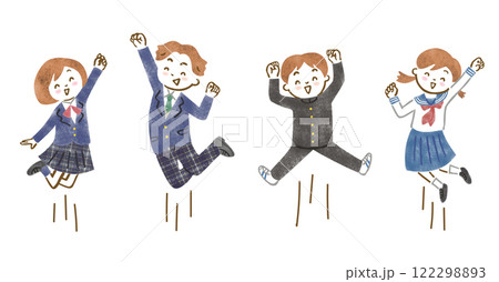 ガッツポーズでジャンプしている制服を着た中高生男女4人のイラストセット